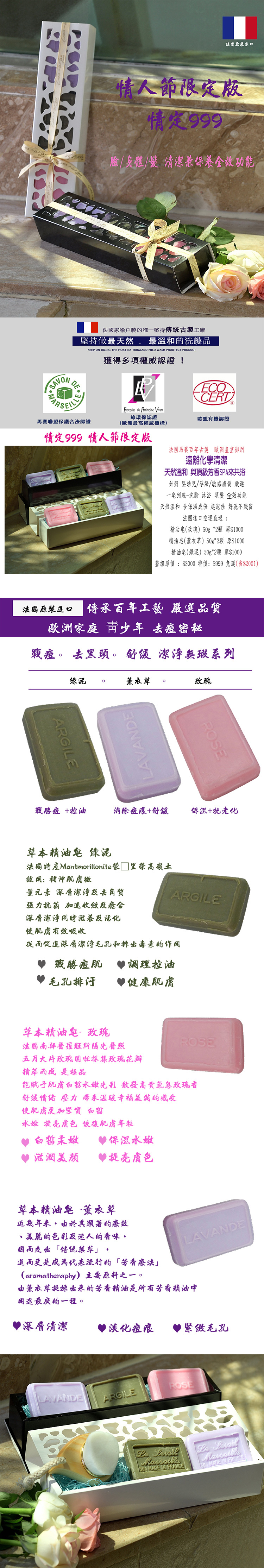 法國進口 草本精油皂 ( 綠泥/玫瑰/薰衣草 三款/盒) 50gx3